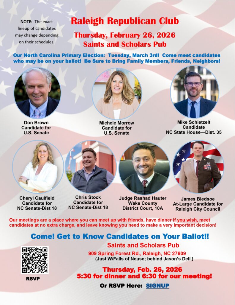 With the NC Primary Election just around the corner on March 5th, 2024, you surely will want to be an informed voter. So come to our February 8th meeting to hear from numerous candidates, especially those running for NC State offices.