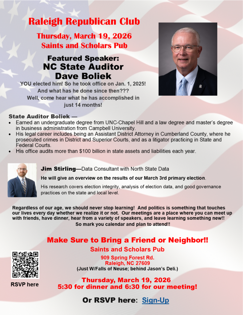 Come to our RRC April meeting to meet and hear from Jack Clark, candidate for NC State Auditor, as well as Brad Knott, candidate for US Congress, Dist. 13.